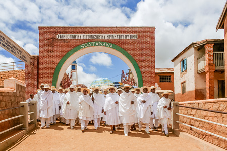 Soatanana, Madagascar, March 05, 2013: Disciples of the white shepherds of Soatanana in their Sunday procession. They are a fundamentalist branch of Protestantism very specific in Madagascar. All the inhabitants are dressed in white.