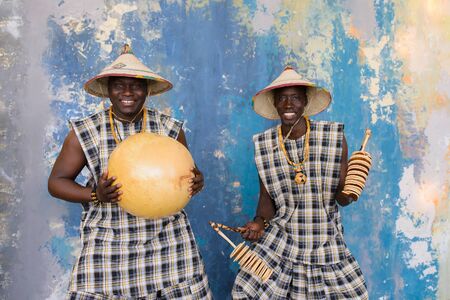 Hands of an African man in national clothes holds djembe drum surrounded by seashells