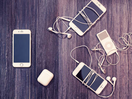 Moscow, Russia - December 26, 2017: A music player iPod nano with old dirty headphones and iPhones 5, 6, 6s are on a dark wooden background. Products developed by Apple Inc