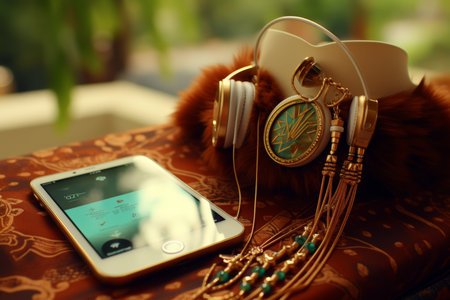 phone and headphones on table top view