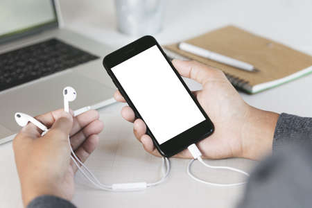 Smart phone and earphones on hand