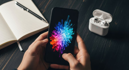 The image shows a pair of hands holding a smartphone displaying a vibrant, colorful wallpaper. The phone is positioned next to an open notebook with a pen resting on it and a pair of wireless earbuds in their charging case. The scene suggests a workspace or study area, emphasizing technology and productivity.
