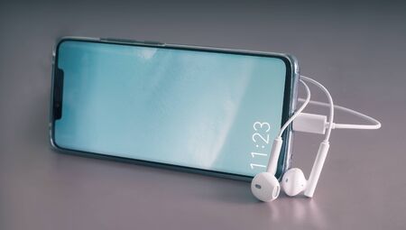 Modern smartphone and headphones on a gray background. Close-up, front view, copy space