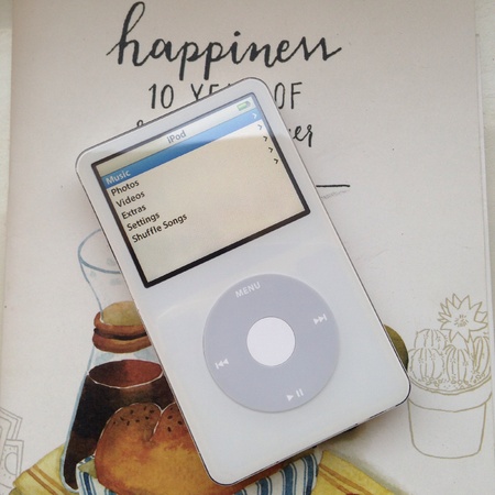 Close Up Overview of iPod MP3 Music Player with Ear Bud Headphones Shot on Plain Background in Blue Cool Tone Lighting