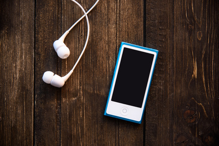 white earphones and blue music player on wooden background.