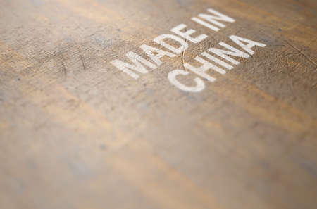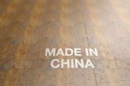 An extreme close up of a worn print sign that reads made in china on a flat wooden product surface - 3D render