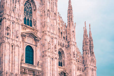 Exterior architecture of Milan Cathedral, known as Duomo di Milano, one of the largest churches in the world.
