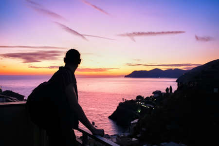 Man at dusk looking at the sunset with Mediterranean sea on the background in Cinque Terre, Italy