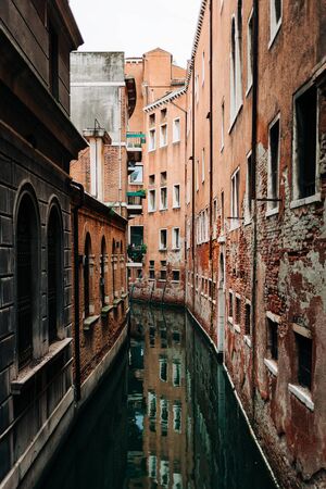Channel in Venice with bridge boat gondola and old authentic italian houses. Cloudy day in old town. Italy.