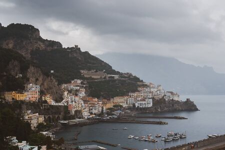 Amalfi cityscape on coast line of mediterranean sea, traveling in Italy