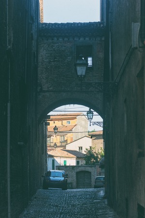 The narrow streets with tall buildings and tourist pointer to Dante in Italy on a summer day
