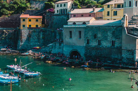 CINQUE TERRE, ITALY - Aug 10, 2018: houses and moutains near sea in Liguria, Italy