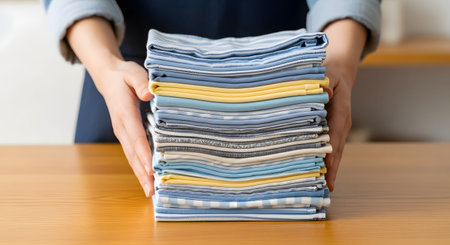 A person holds a tall, neat stack of folded fabrics or linens in shades of blue, white, and yellow. The image highlights organization, laundry care, and the texture of clean textiles.