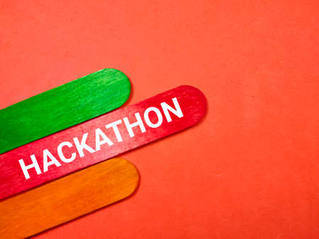Business concept.Text HACKATHON writing on colored ice cream sticks on a red background.