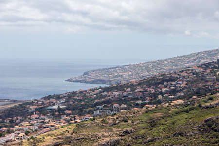 Beautiful madeira spectacular landscape high over machico with view to the airport Christiano Ronaldo and coastline with high cliffs, horizon and the sea.