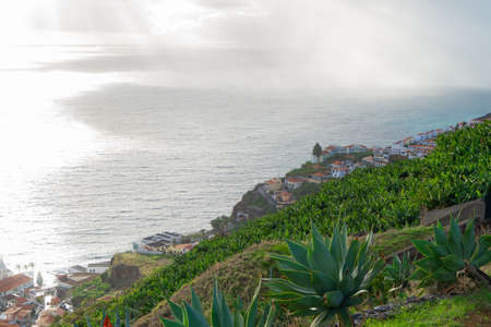 View from the cliffs down to the small city ponta delgada at the north coast of madeira, portugal. Lying on a headland of the island pointing in the sea, high mountains surrounding it, with small typical madeiran villages and houses.