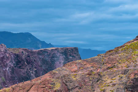 Ponta de Sao Lourenco, Madeira, Portugal. Beautiful scenic mountain view of green landscape,cliffs and Atlantic Ocean. Hiking active day fresh summer scene. Travel holiday background