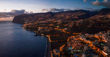 Aerial blue hour view of Funchal coast, Madeira, Portugal at twilight