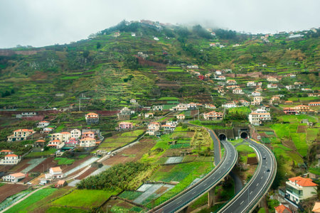 Countryside with highway tunnels and tiered farming, Madeira, Portugal.