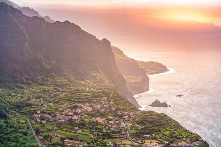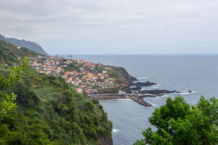View from the cliffs down to the small city ponta delgada at the north coast of madeira, portugal. Lying on a headland of the island pointing in the sea, high mountains surrounding it, with small typical madeiran villages and houses.