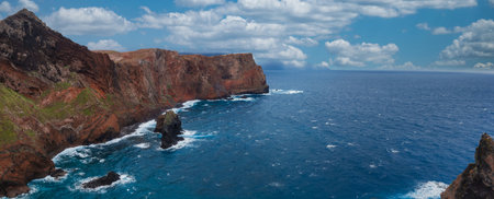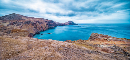 Ponta de Sao Lourenco, Madeira, Portugal. Beautiful scenic mountain view of green landscape,cliffs and Atlantic Ocean. Hiking active day fresh summer scene. Travel holiday background