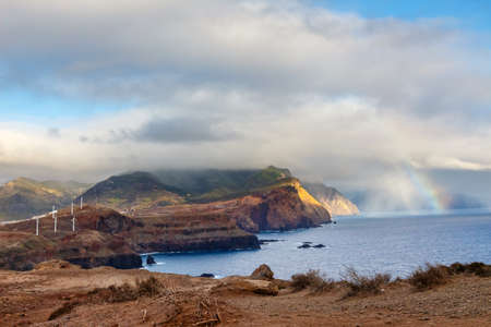 Sunrise and beautiful rainbow over Ponta de Sao Lourenco, Madeira, Portuga