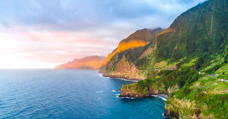 Beautiful scenic sunset view on cliffs coast of Atlantic Ocean with blue breaking waves in Madeira island