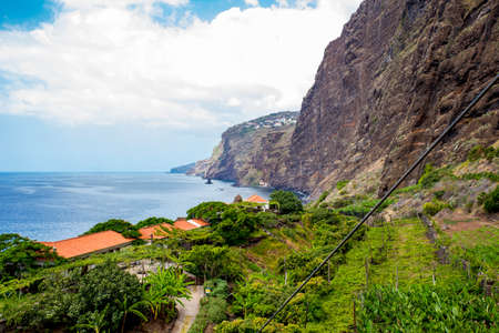 Village of Fajã dos Padres ( Faja dos Padres) in Madeira island, Portugal. Blue ocean, old buildings with red roofs, houses on cliff, bird of paradise flower bush growing.