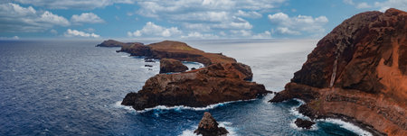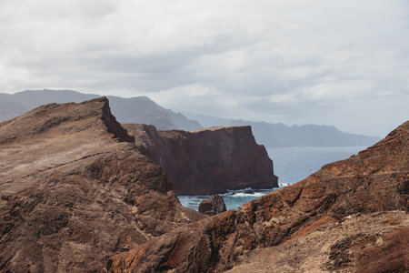 Stormy sea and rocks in the waves at ponta Sao lourenco at the edge of the island of madeira, Portugal. Very special landscape with volcanic brown and yellow stone. stormy weather and sea. Perfect concept for landscape traveling outdoor activities.