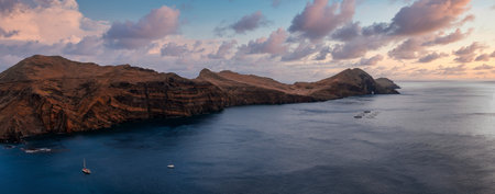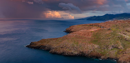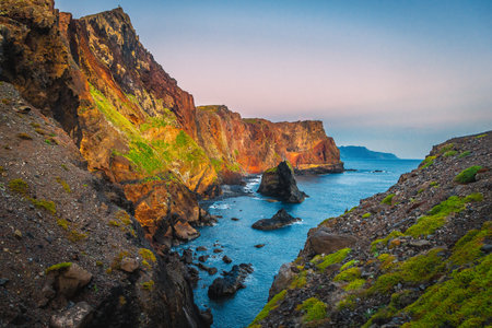 Sunset over Maderia island landscape, Ponta de sao Lourenco. It is a wonderful view of the sea cliffs, Portugal. It is a natural background. It's summer.