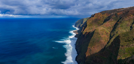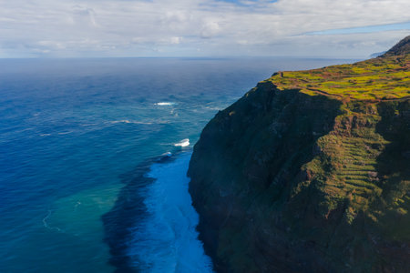 Aerial cliffs and surf along Madeira Island north coast, Portugal
