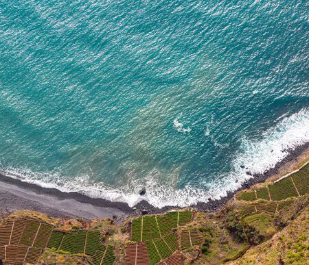 Aerial landscape by the blue Atlantic ocean. Stone beach and adjacent fields on the southern coast of Madeira Island, Portugal.