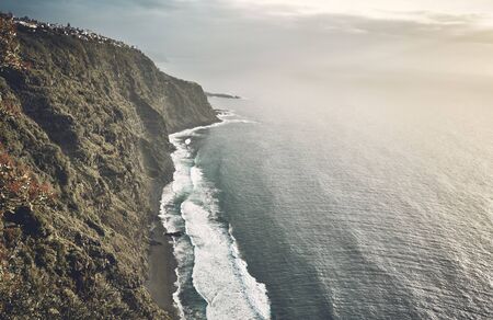 Volcanic beach seen from a cliff at sunset, color toning applied, Tenerife, Spain.