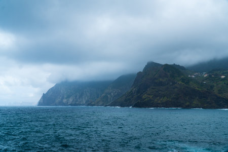 Dramativ scene on madeiras north coast with dark clouds, high mountains and a coast line with steep cliffs. in the front green fields and the small village of sao Jorge. Blue sea with big waves.