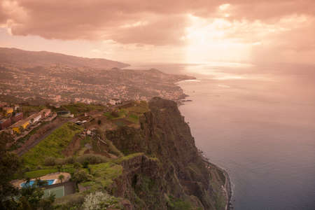 View on village with coastline during sunset with sun star at Madeira