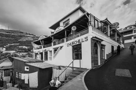 Camara de Lobos, Madeira, Portugal - December 10, 2016: Winston Churchill was a fan of Madeira and spent time in Camara de Lobos. This fish restaurant is named after him. Black and white photography.