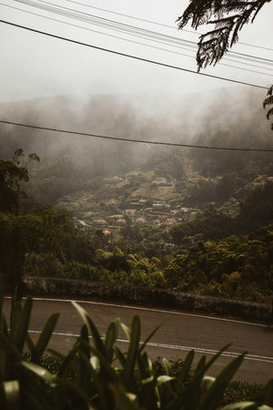 A drone shot of an empty mountain road above the clouds in Madeira Island, Portugal