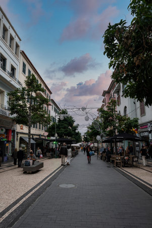 Funchal pedestrian street at dusk with cafes and holiday lights