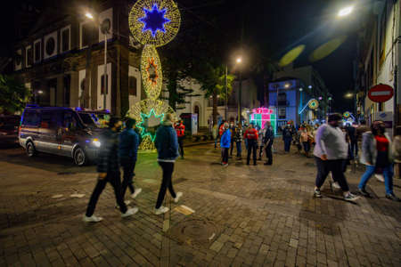 La Laguna, Tenerife, Spain - November 28, 2020: Night streets decorated for christmas and new year during a pandemic. Walk through the pre Christmas La Laguna, the old capital of Tenerife.