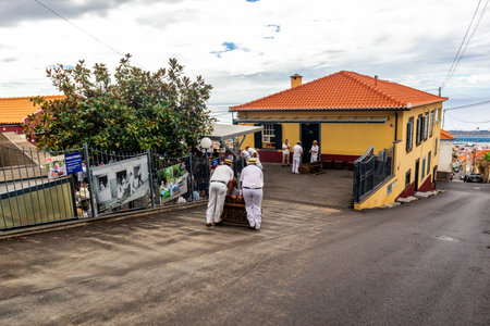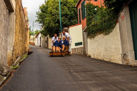 Famous fun tourist activity in Funchal, Madeira island, Portugal. Toboggan riders pushing wooden sledge with tourists downhill with high speed