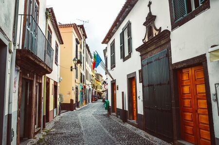 Funchal, Madeira, Portugal - Sep 21, 2019: A cobbled street in the historical center of the Madeiran capital with an overcast sky. Historical houses with waving Portuguese and EU flags. Old town.