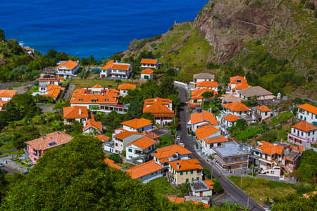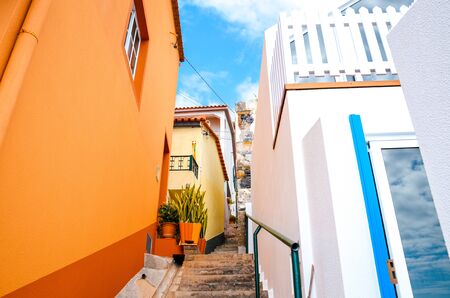Colorful narrow cobbled street in village Jardim do Mar, Madeira, Portugal. Stone steps along with local buildings. Orange and white facade. Houses in the Mediterranean style. Generic architecture.