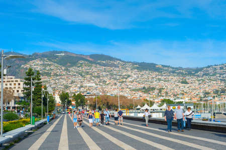FUNCHAL, MADEIRA ISLAND, PORTUGAL - FEB 04, 2020: Group of people walking by embankment of Funchal. Funchal is the capital and main sea port of Madeira
