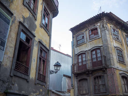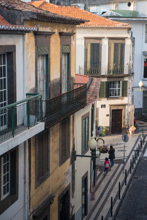 Funchal, Madeira Island, Portugal - December 27, 2021: Typical architecture of residential buildings in the historic city center on a winter day