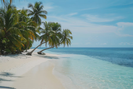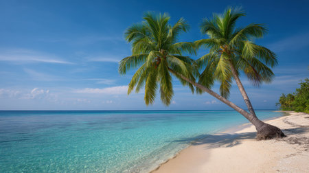 A tranquil tropical beach scene features palm trees gently swaying beside clear waters. The sunlit shore invites relaxation in a perfect getaway.