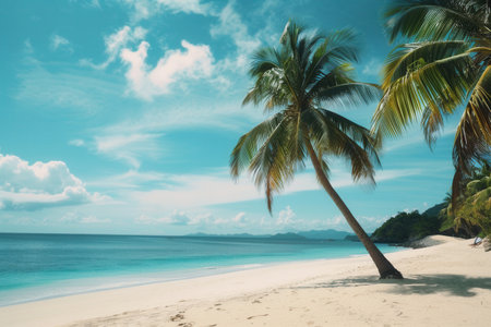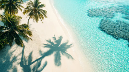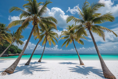 Scenic tropical beach with tall palm trees casting shadows on pristine white sand. Turquoise ocean waves gently meet the shore under a vibrant blue sky with fluffy clouds. Ideal vacation destination background.