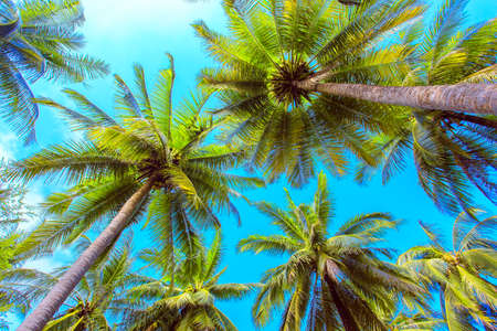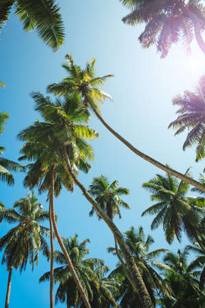 Exotic tropical palm trees at summer, view from bottom up to the sky at sunny day.