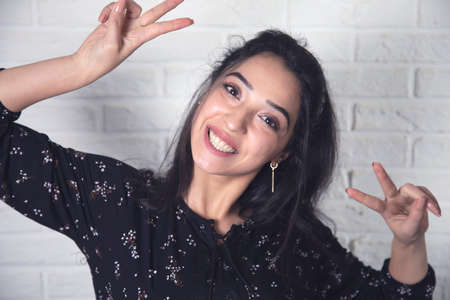 woman hand victory sign on brick wall background