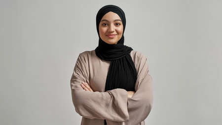 Close up portrait of confident Middle-Eastern woman wearing headscarf in office and looking at camera, copy space