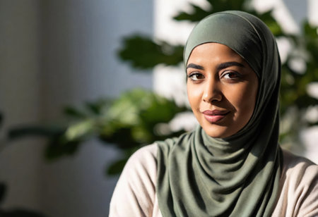 A young woman wearing a stylish hijab smiles gently, surrounded by lush plants indoors.